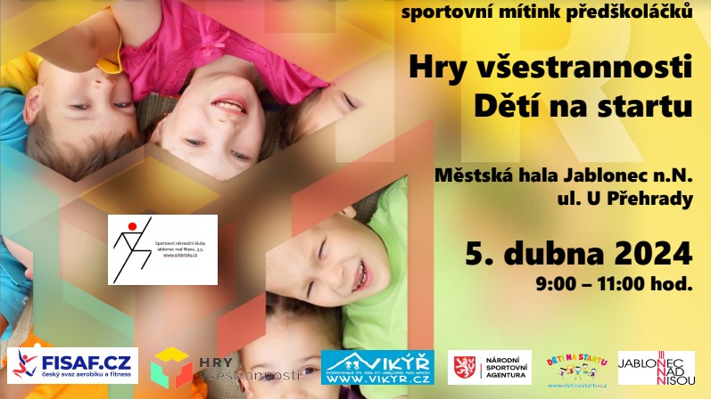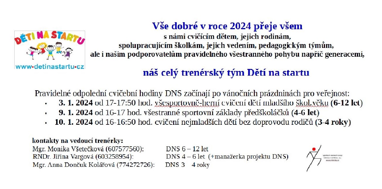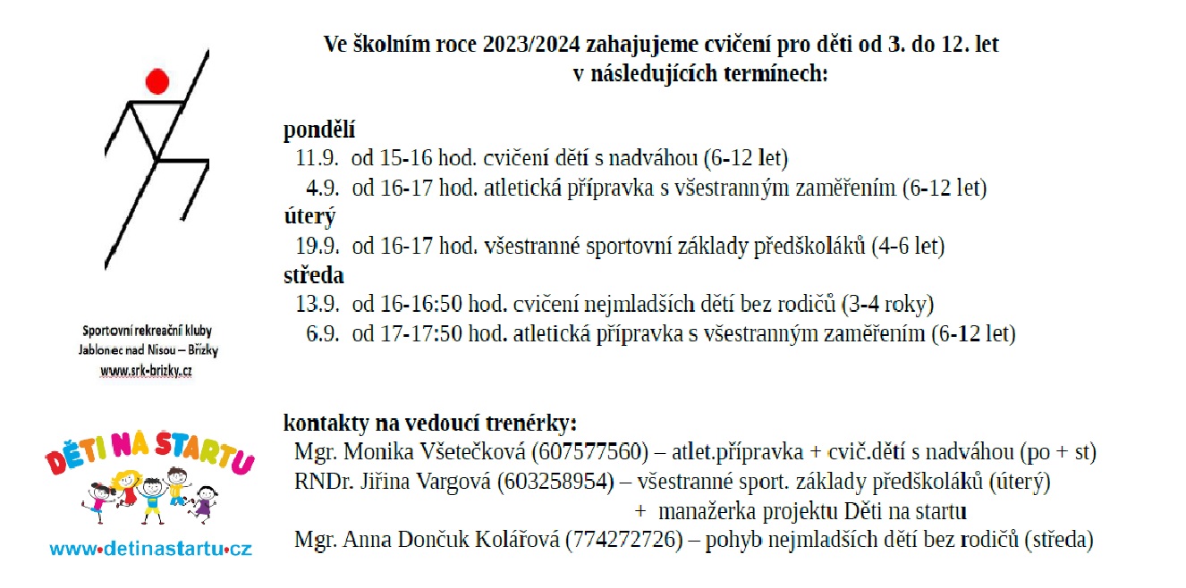 📅 19. 8. 2023Pravidelné cvičební hodiny Dětí na startu budou po letní pauze zahájeny opět během září 2023. Koncem srpna na těchto stránkách upřesníme konkrétní termíny začátků jednotlivých lekcí dle věkových kategorií (cvičební dny a hodiny v týdnu zůstávají u všech aktivit nezměněny … viz. rozvrh tělocvičny). Bližší informace k nim můžete získat nejen zde, ale také během Jablonecké neděle, která se letos uskuteční 10. září mezi 14:00 až 17:00 hod., opět v prostoru mezi městským bazénem a městskou halou. Najdete nás tam ve stánku vedle skate parku.
